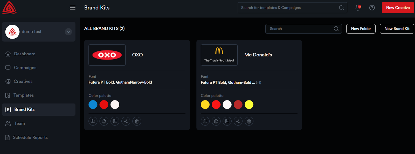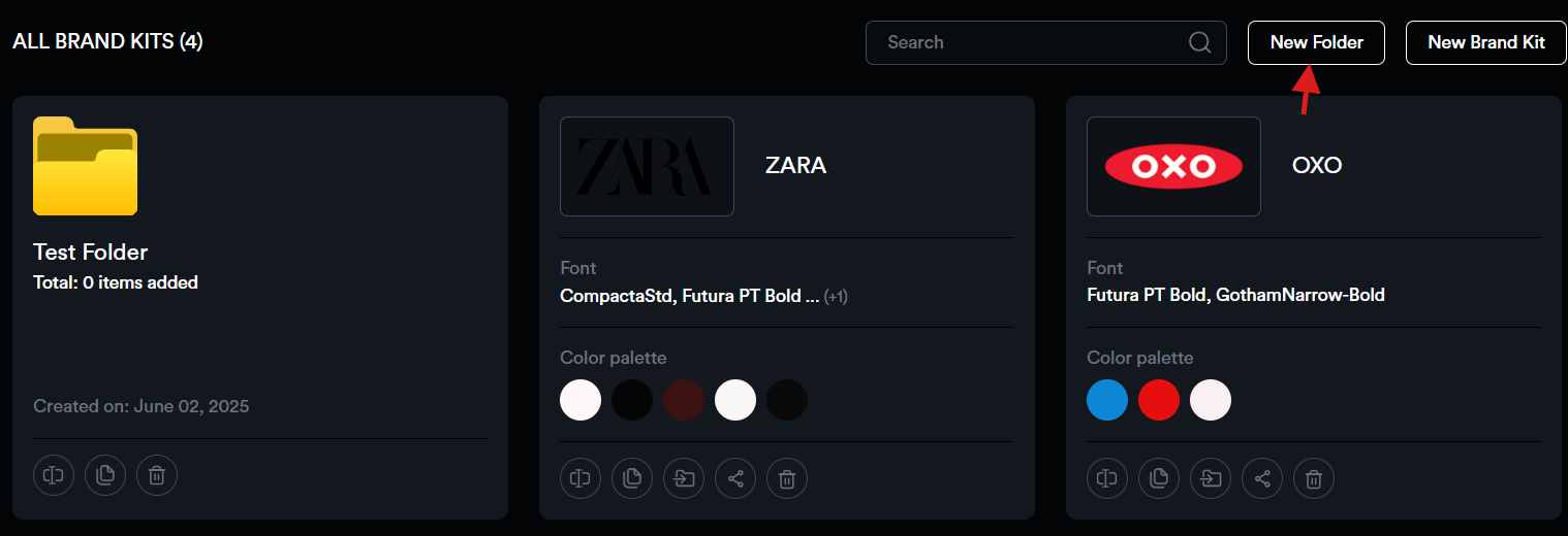 3. Move to Folder – Organize Brand Kits into folders. To create a new folder, click ‘New Folder’ and enter a name. Then, use the ‘Move to Folder’ option to place the Brand Kit into an existing folder.