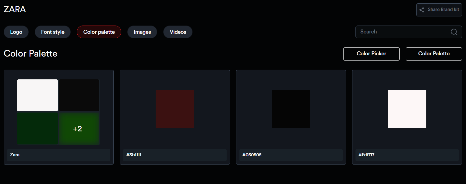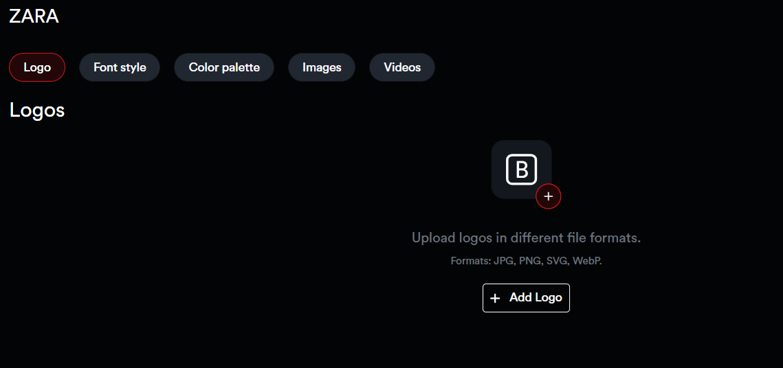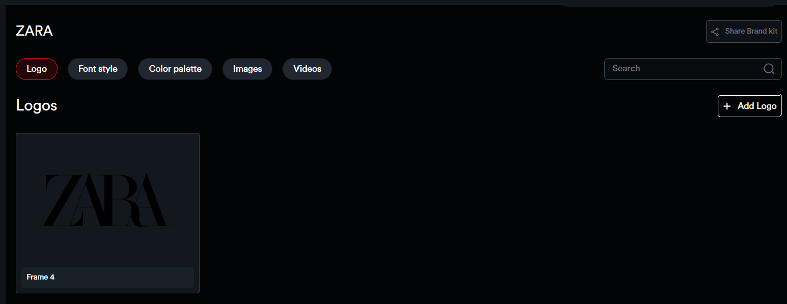 You're now inside the Brand Kit. Here, you can add logos, fonts, colors, images, and videos to customize your brand kit.