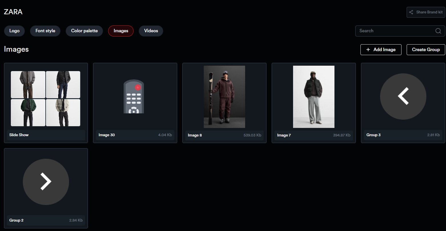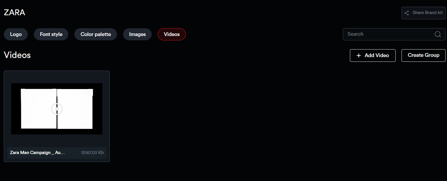 In the Videos section, users can upload and save video assets for the brand. These assets can also be organized into different groups.