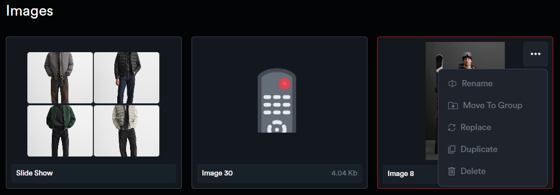 Each uploaded image includes options to Rename, Move to Group, Replace, Duplicate, or Delete.