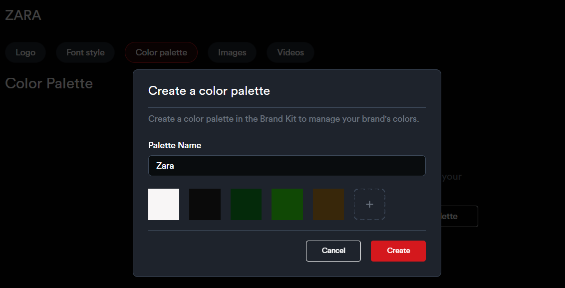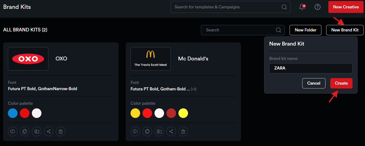 To create a new Brand Kit, click on ‘New Brand Kit’, enter a name, and then click ‘Create’.
