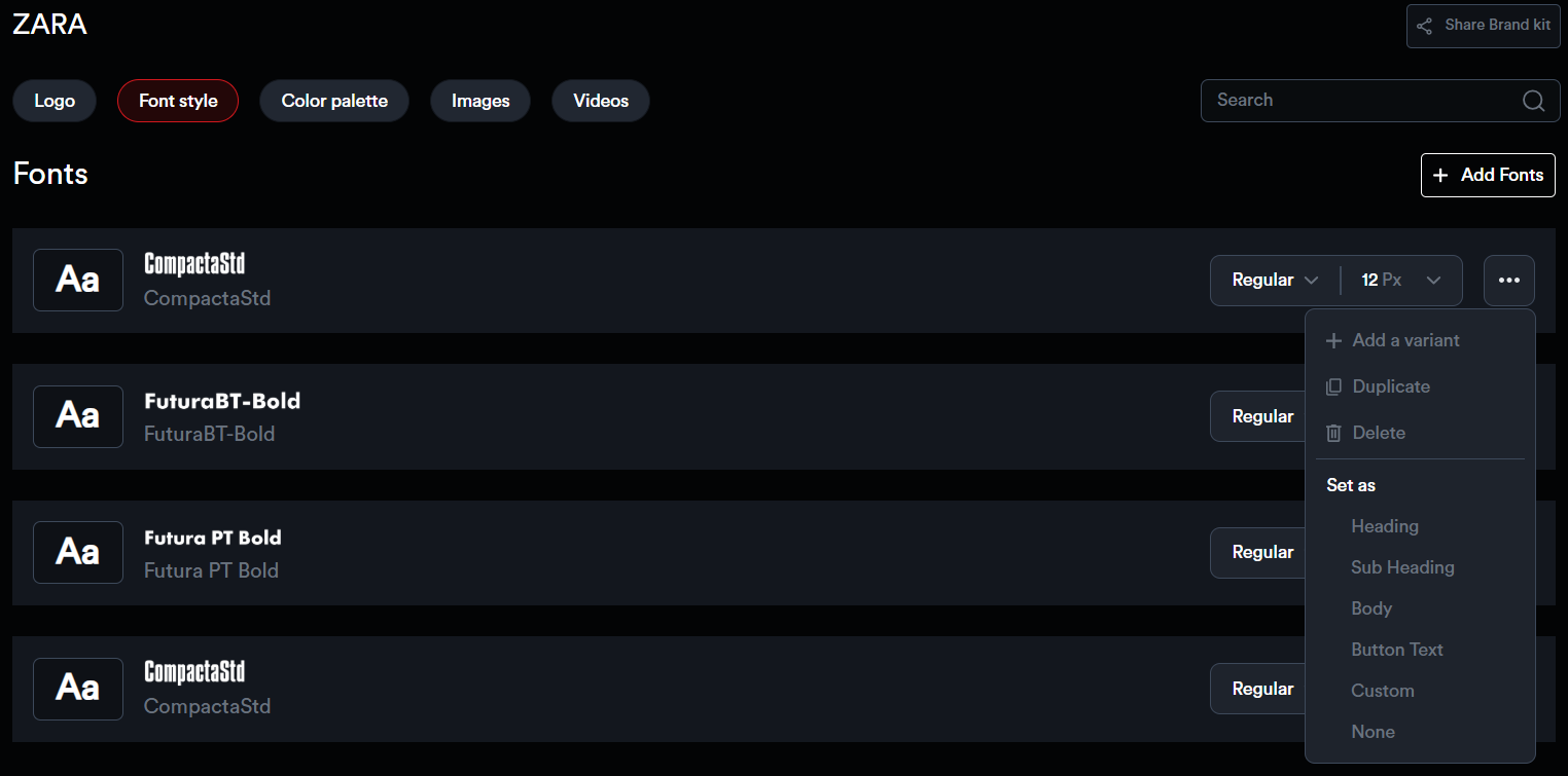 For each font added to the kit, users can create a variant, duplicate it, or delete it. Fonts can also be categorized by setting them as Heading, Subheading, Body, Button Text, Custom, or None.