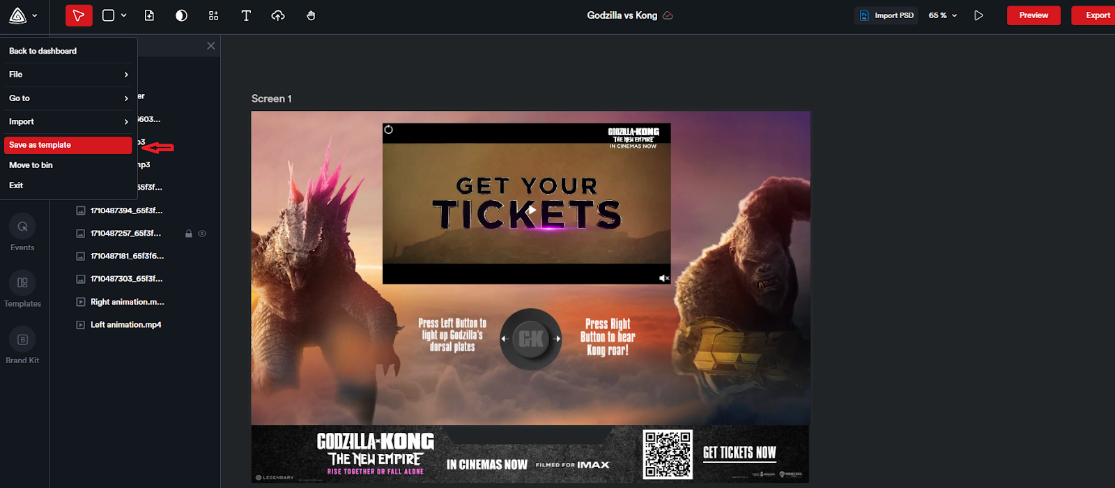While on the editor page of your creative, open the navigation menu and select ‘Save as Template’. A pop-up will appear prompting you to enter a name for your template. Click ‘Create’ to save it. All templates you create will be stored under Templates > My Templates, where you can view or customize them as needed.