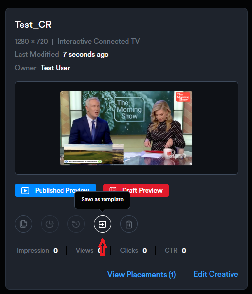 You can also save a creative as a template without opening the editor. Open your campaign and locate the creative you want to convert. On the creative card, click the ‘Save as Template’ icon. A pop-up will appear, allowing you to name the template. Click ‘Create’ to save it.