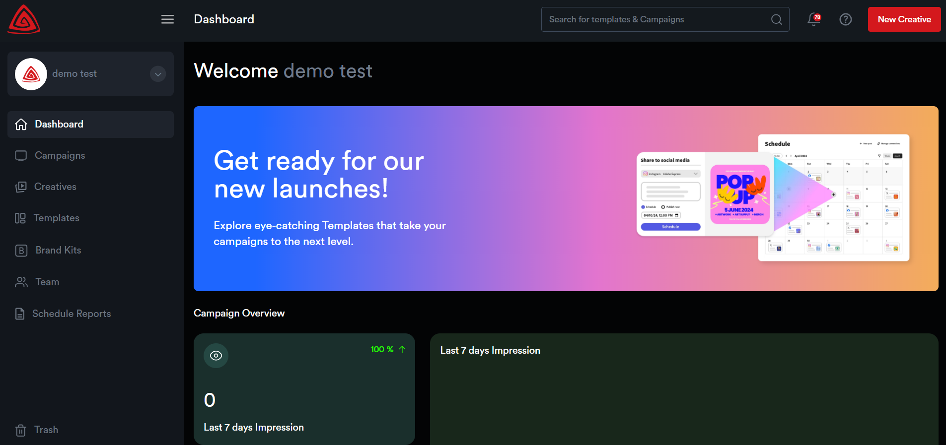 It also lists recently created creatives along with performance indicators and offers quick actions like preview and edit. Additionally, the dashboard highlights newly added templates, making it easy to start building creatives right away.