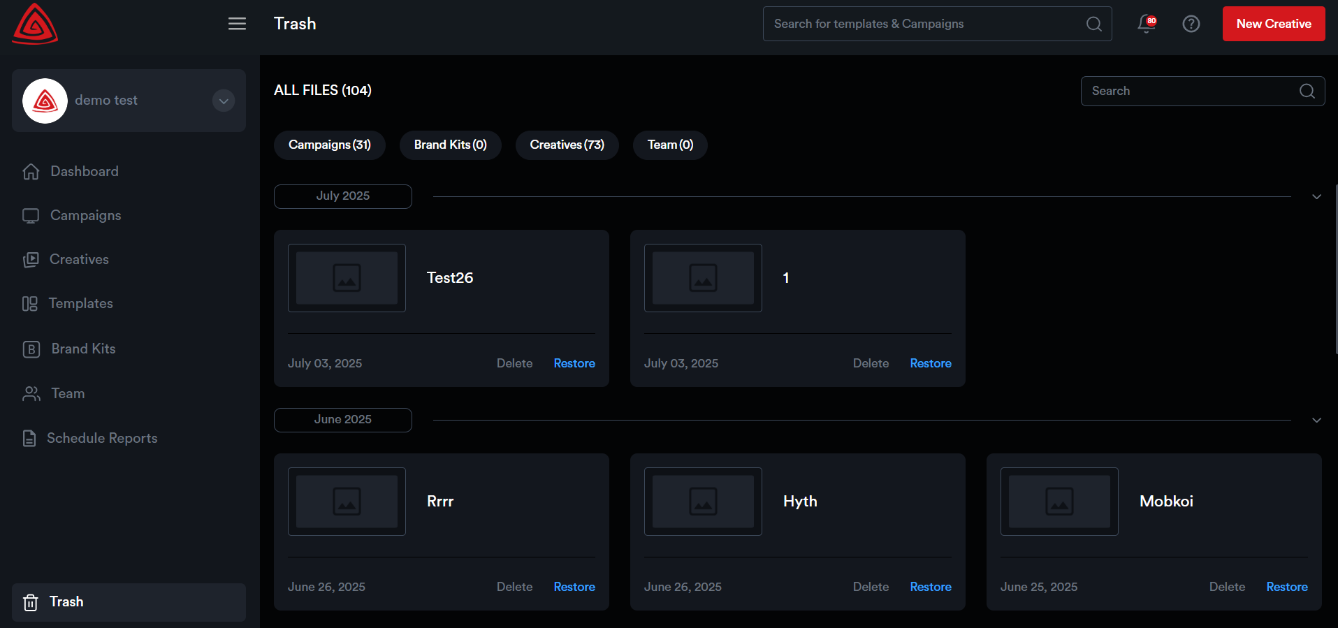 This module contains all deleted creatives, campaigns, and brand kits. Users can either permanently delete these items or restore them for future use.