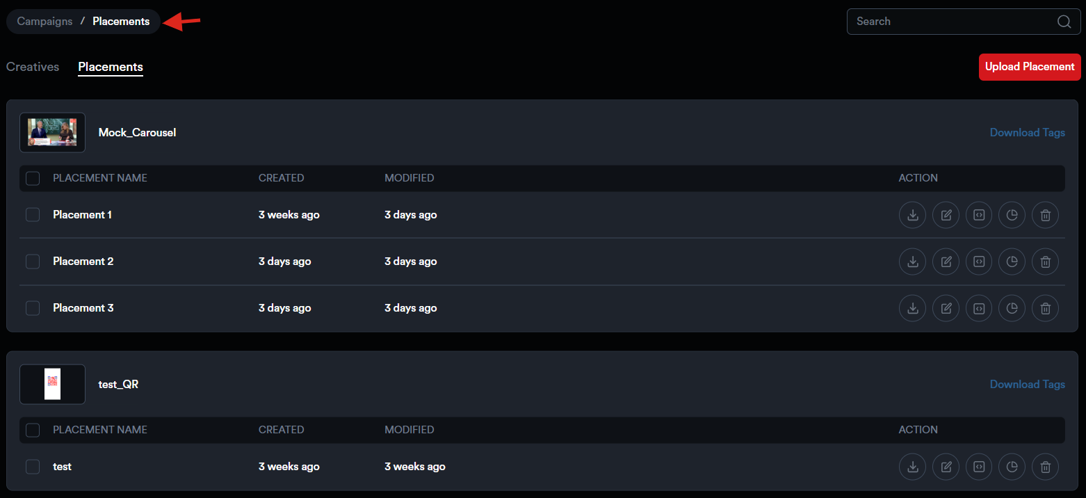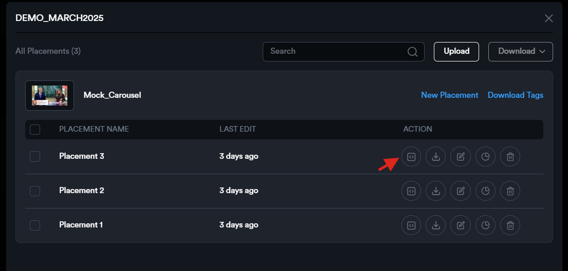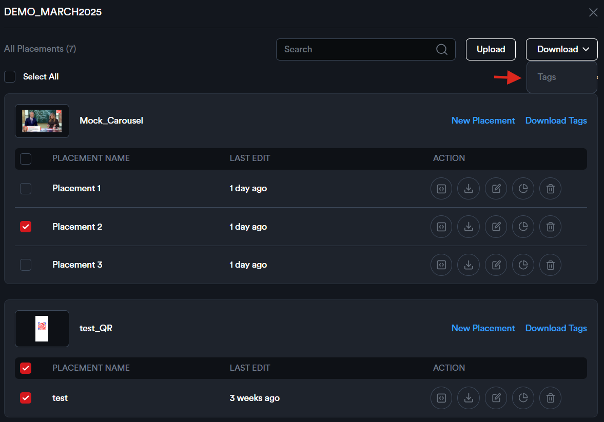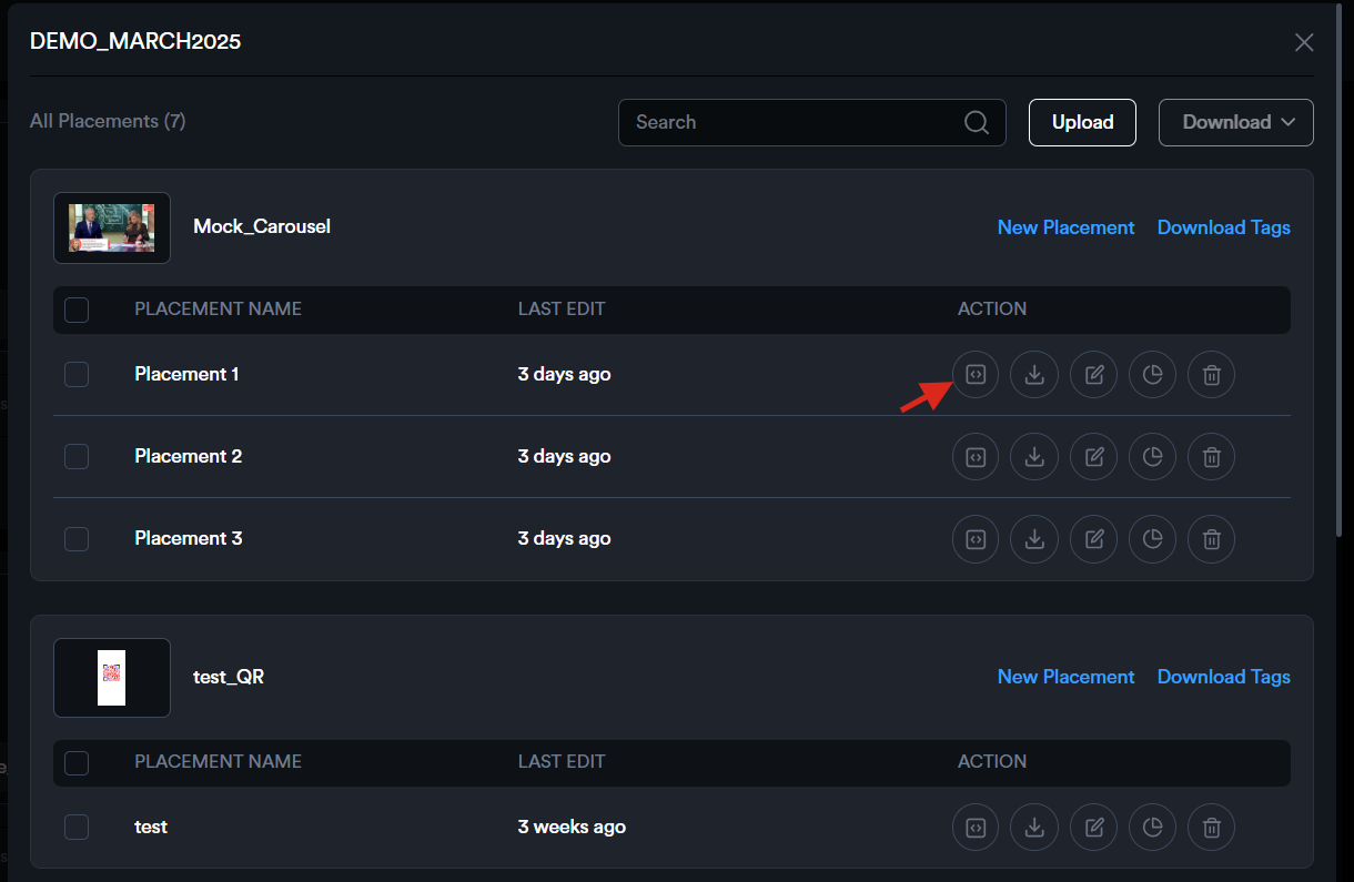 Click the Tag Export icon next to the desired placement to open the modal and copy the tag.