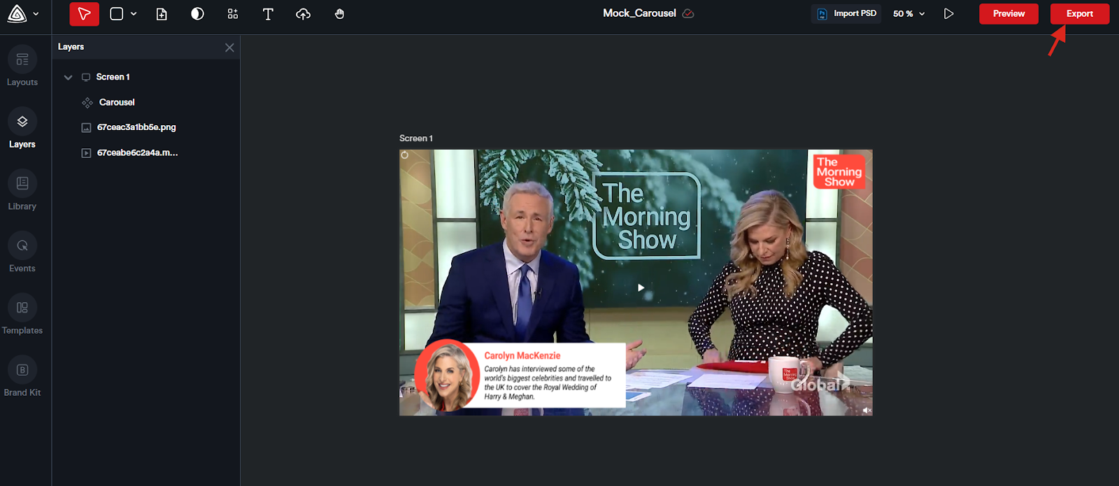 Once the ad is complete, clicking the Export button generates the corresponding ad tag. This action opens the Tag Export modal, which provides several options for copying the tag.