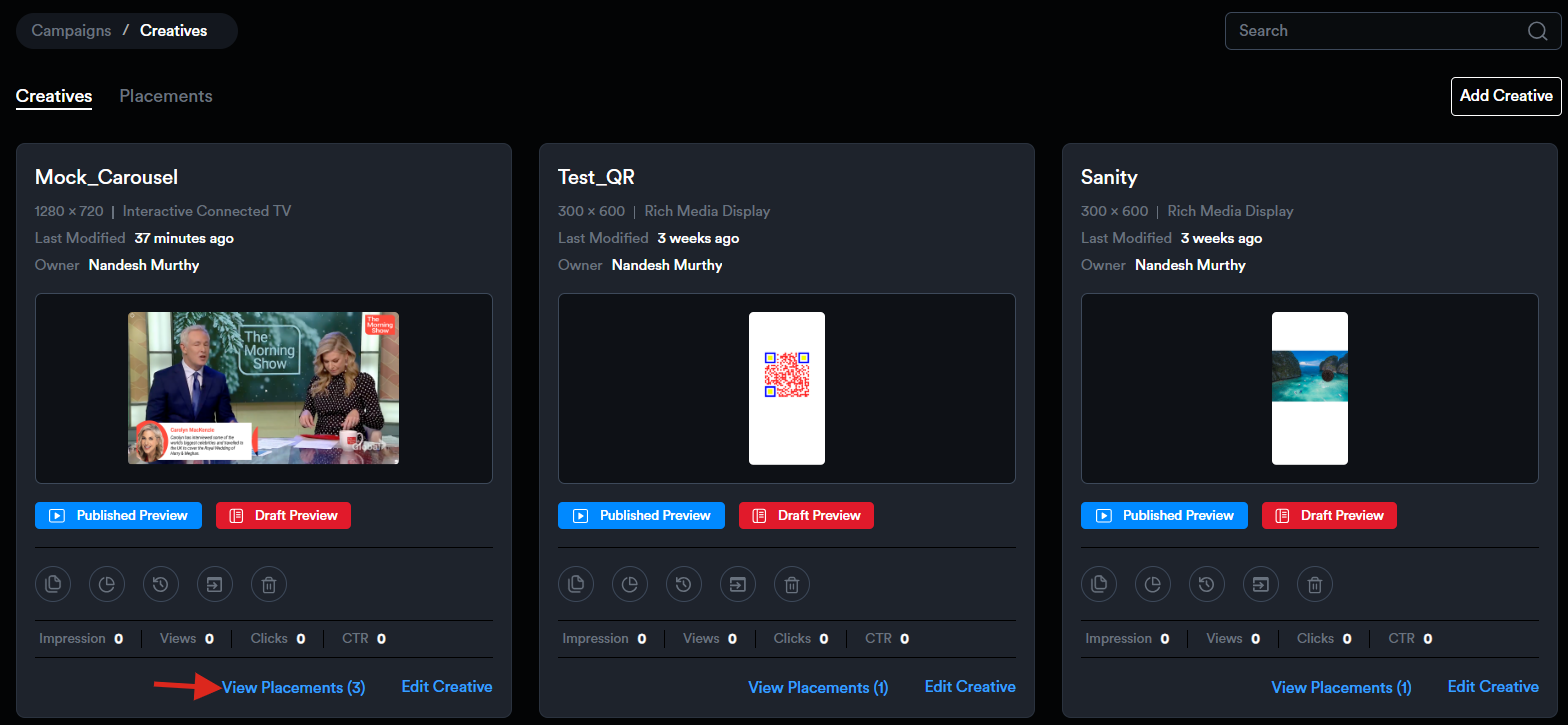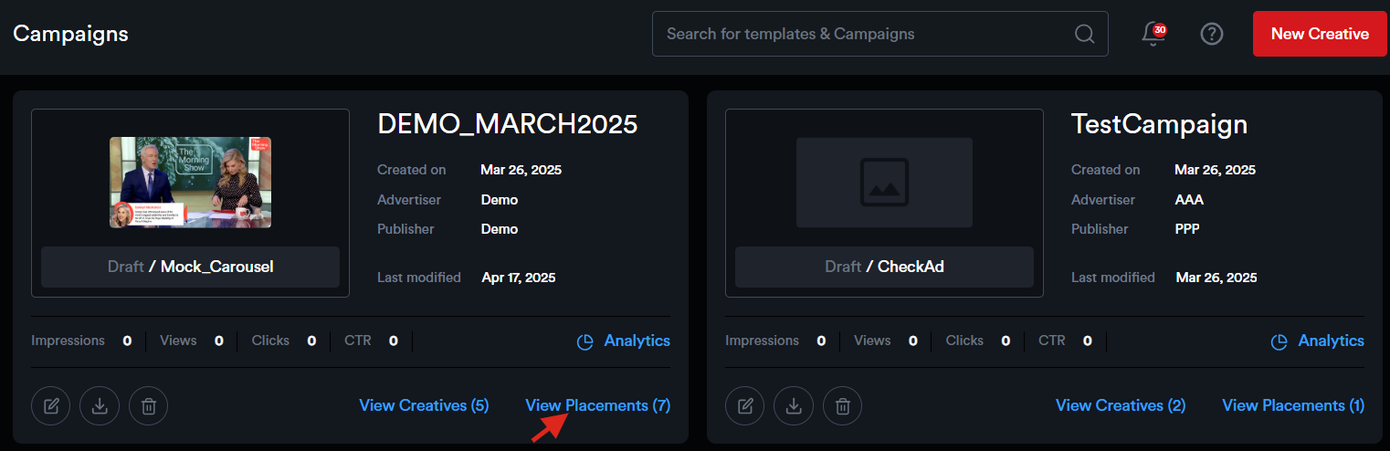 On the campaign card, click "View Creatives" to go to the creative listing page.