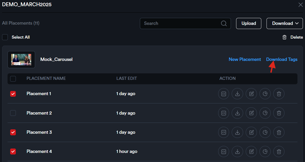 An Excel sheet containing the tags for the selected placements will be downloaded.