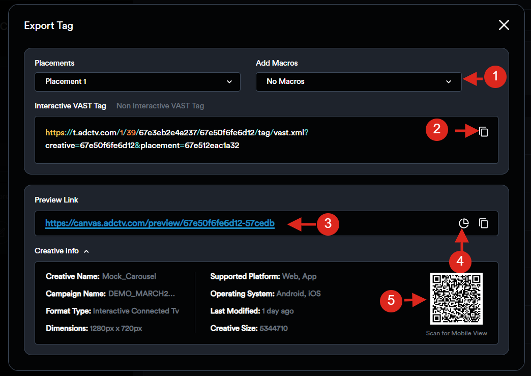 - Additionally, creative details are provided along with a QR code that allows you to preview the ad on a mobile device.