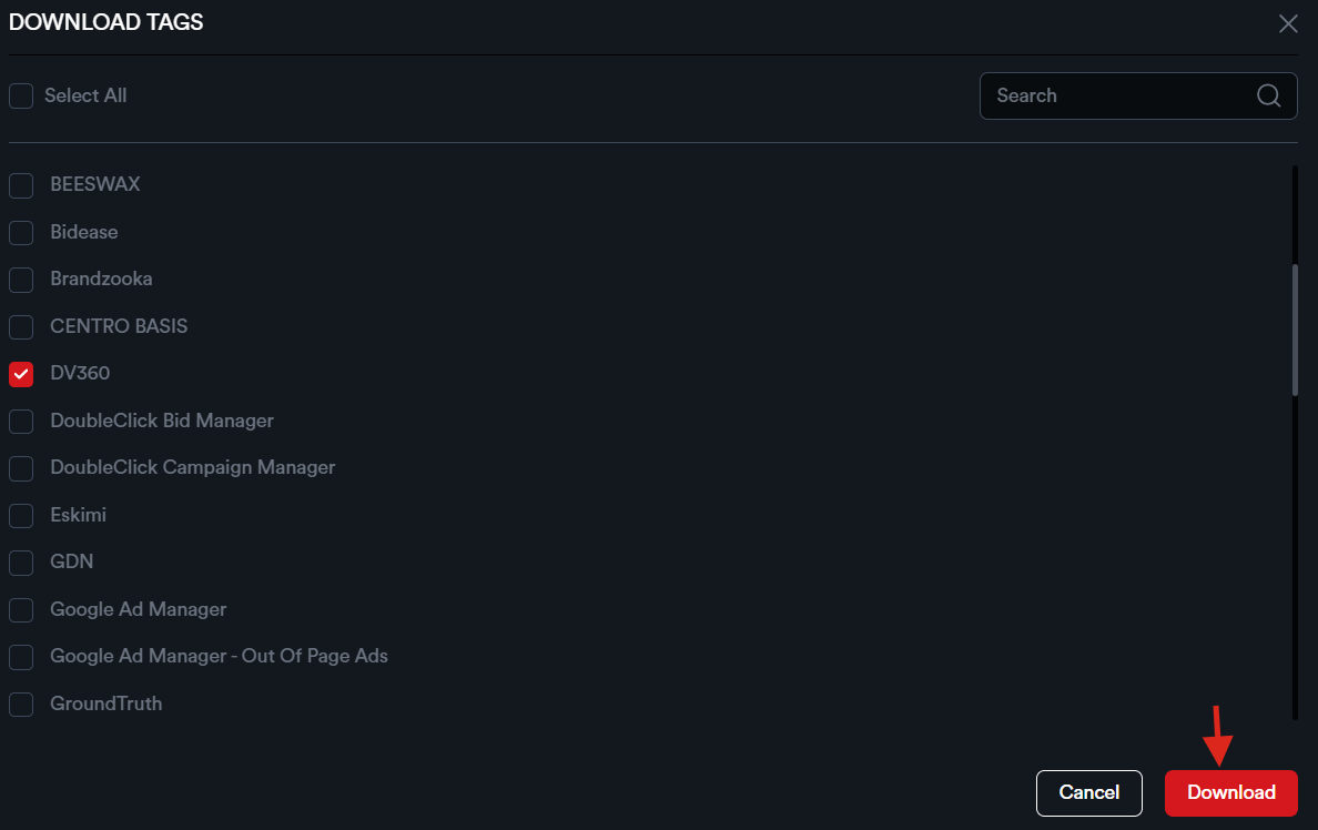 Click the Tag Export icon next to the desired placement to open the Tag Export modal.